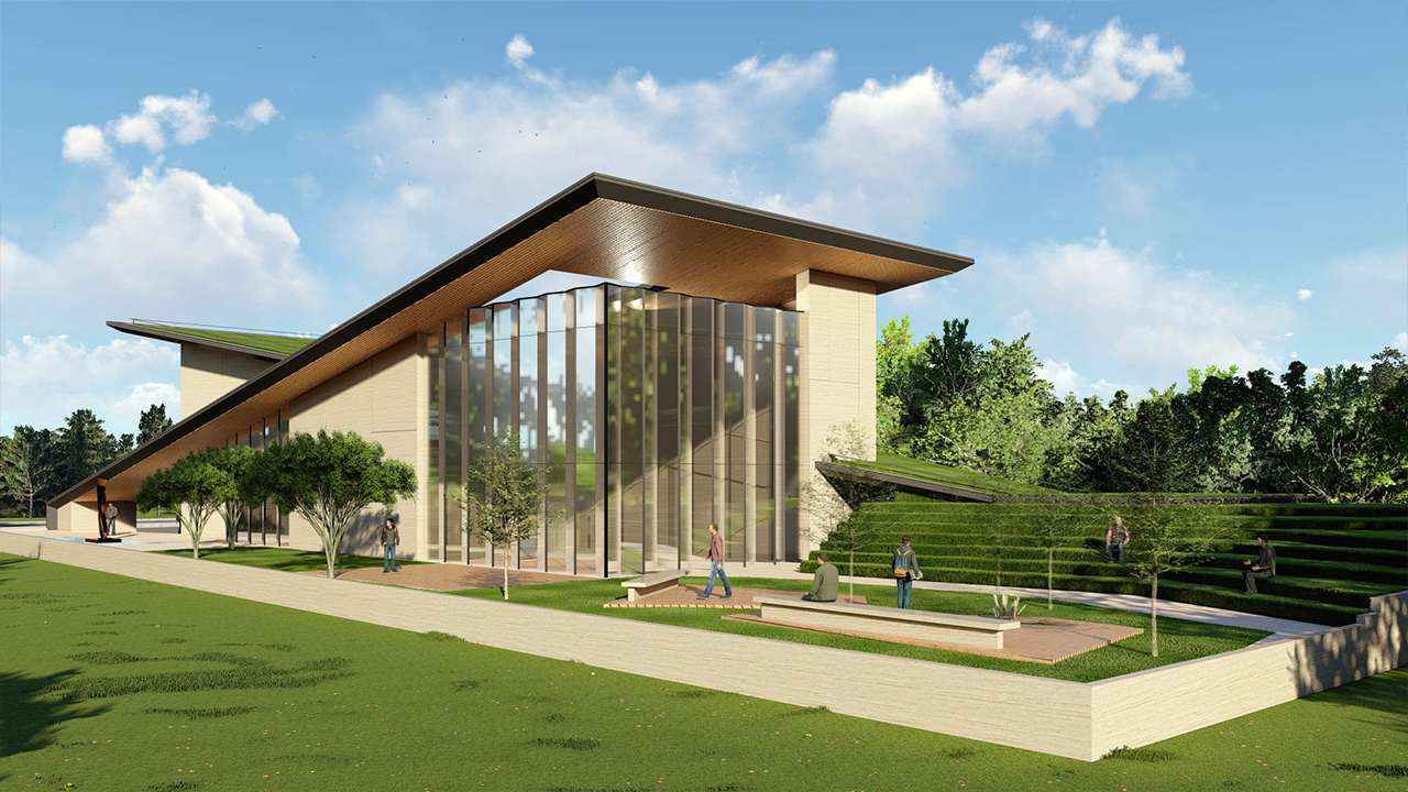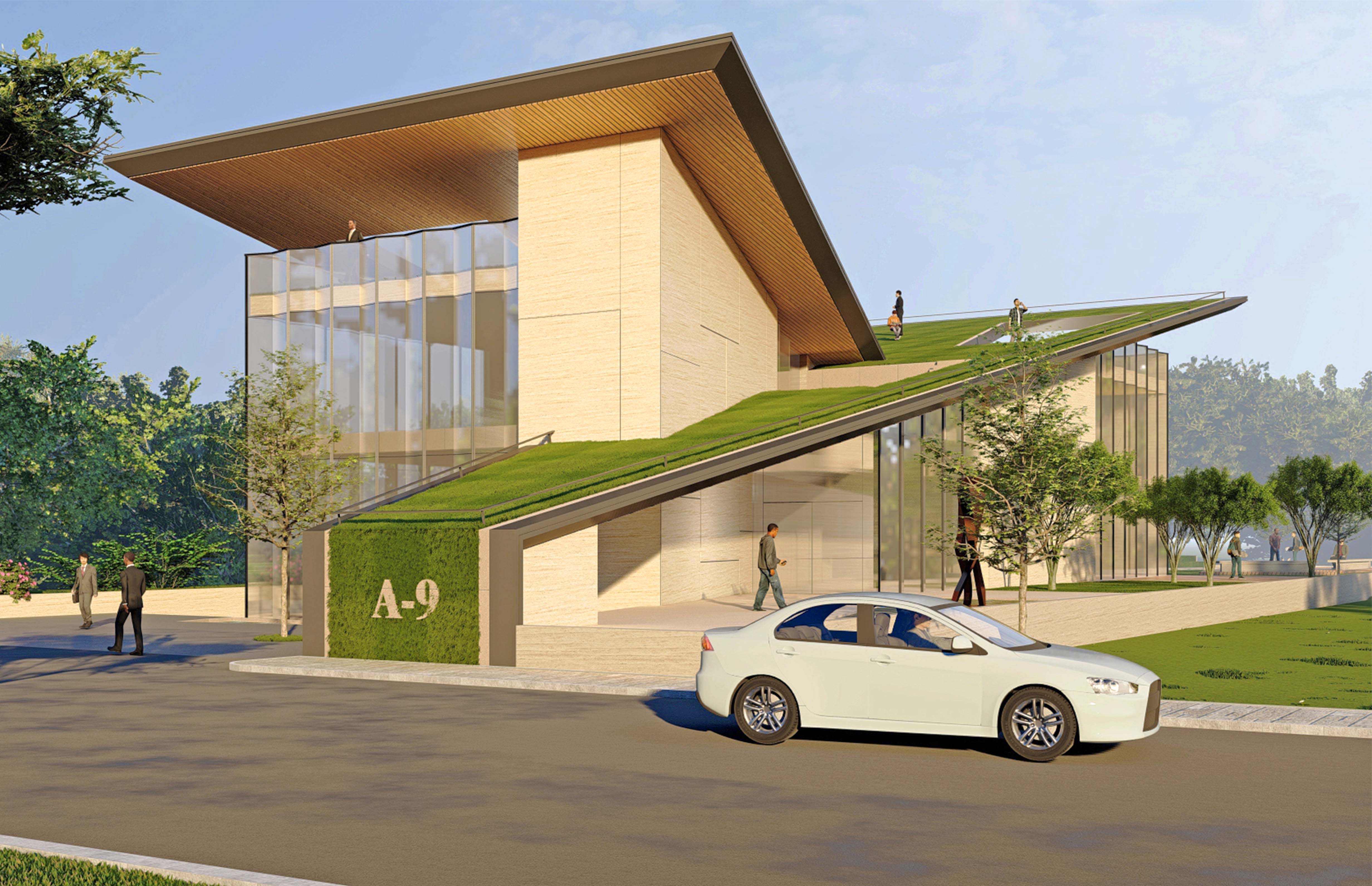 The structure integrates a walkable green roof that blends seamlessly with the surrounding landscape, creating continuity between built and natural environments.