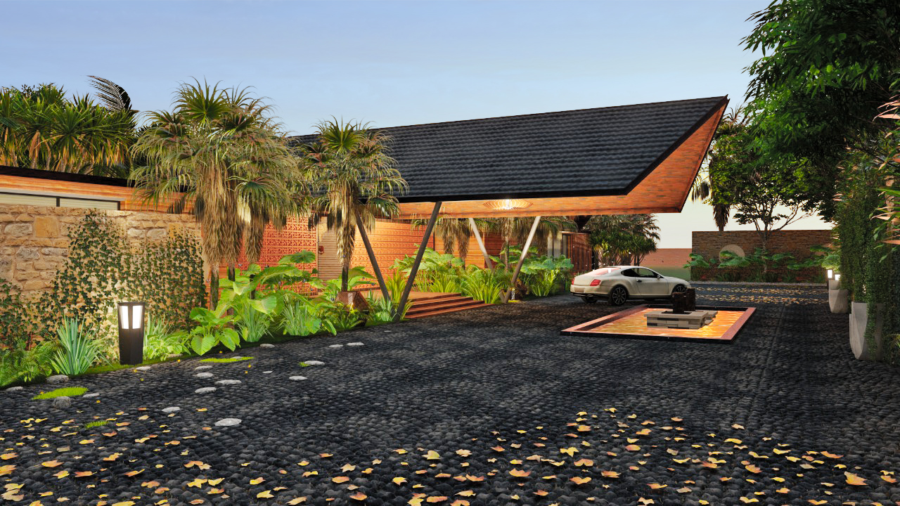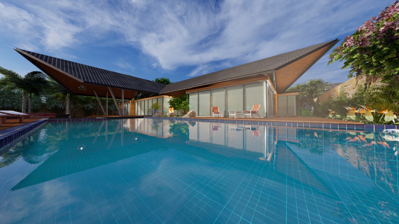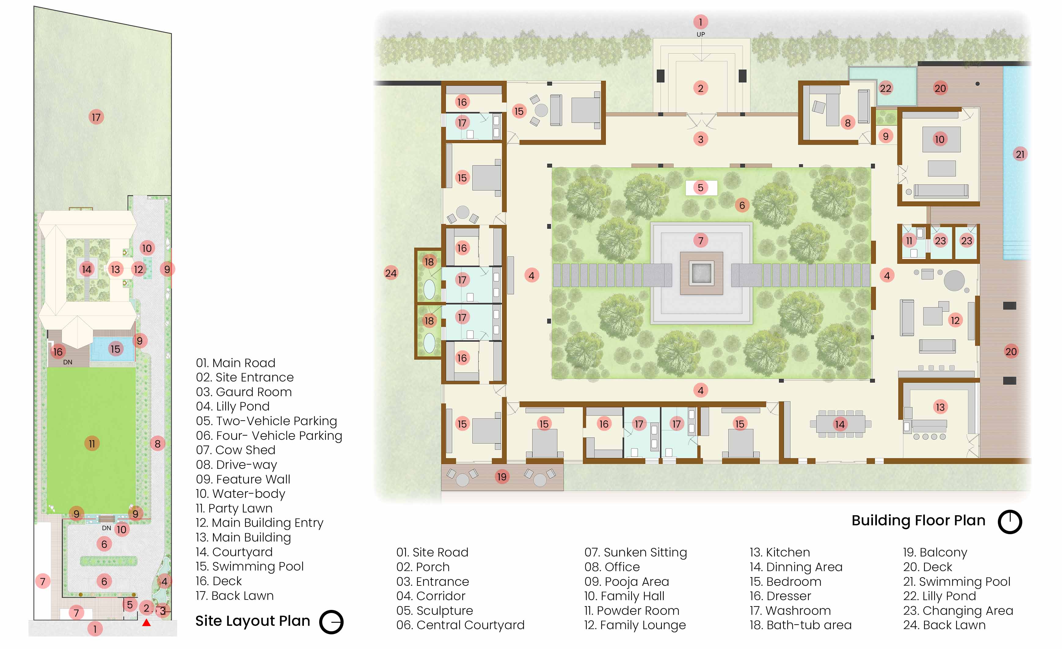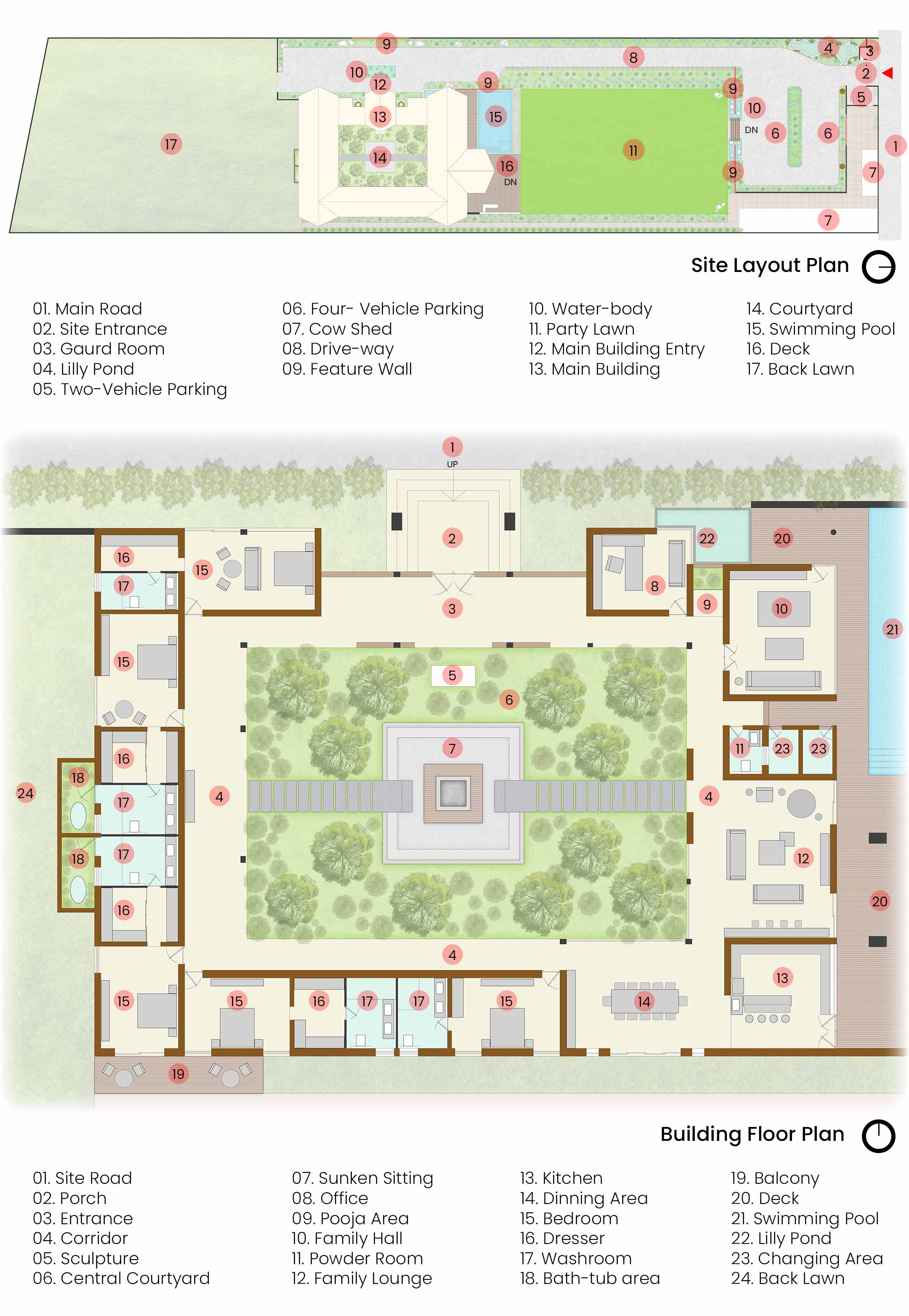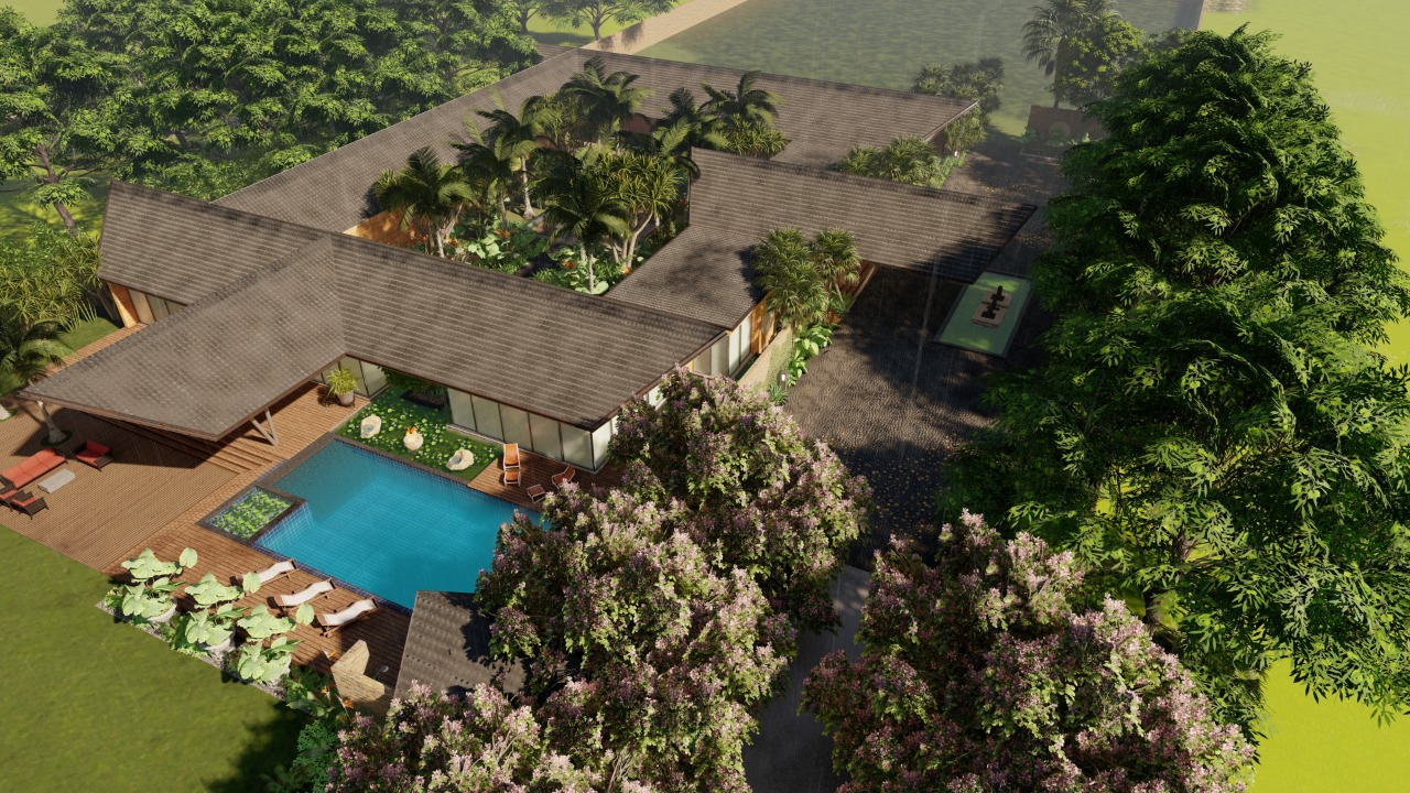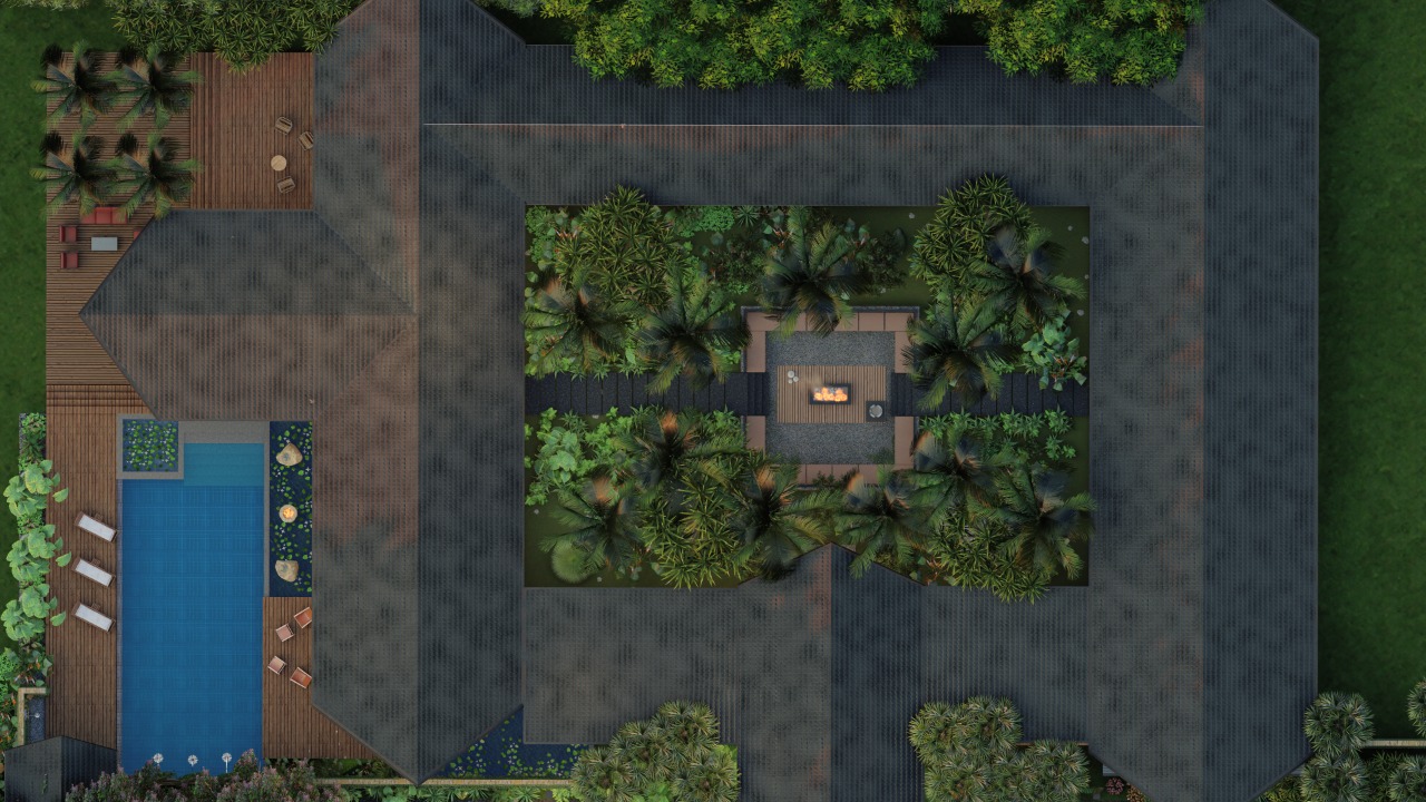 While this inward garden offers quiet refuge, the rest of the layout expands toward long vistas, water edges, and shaded leisure decks.