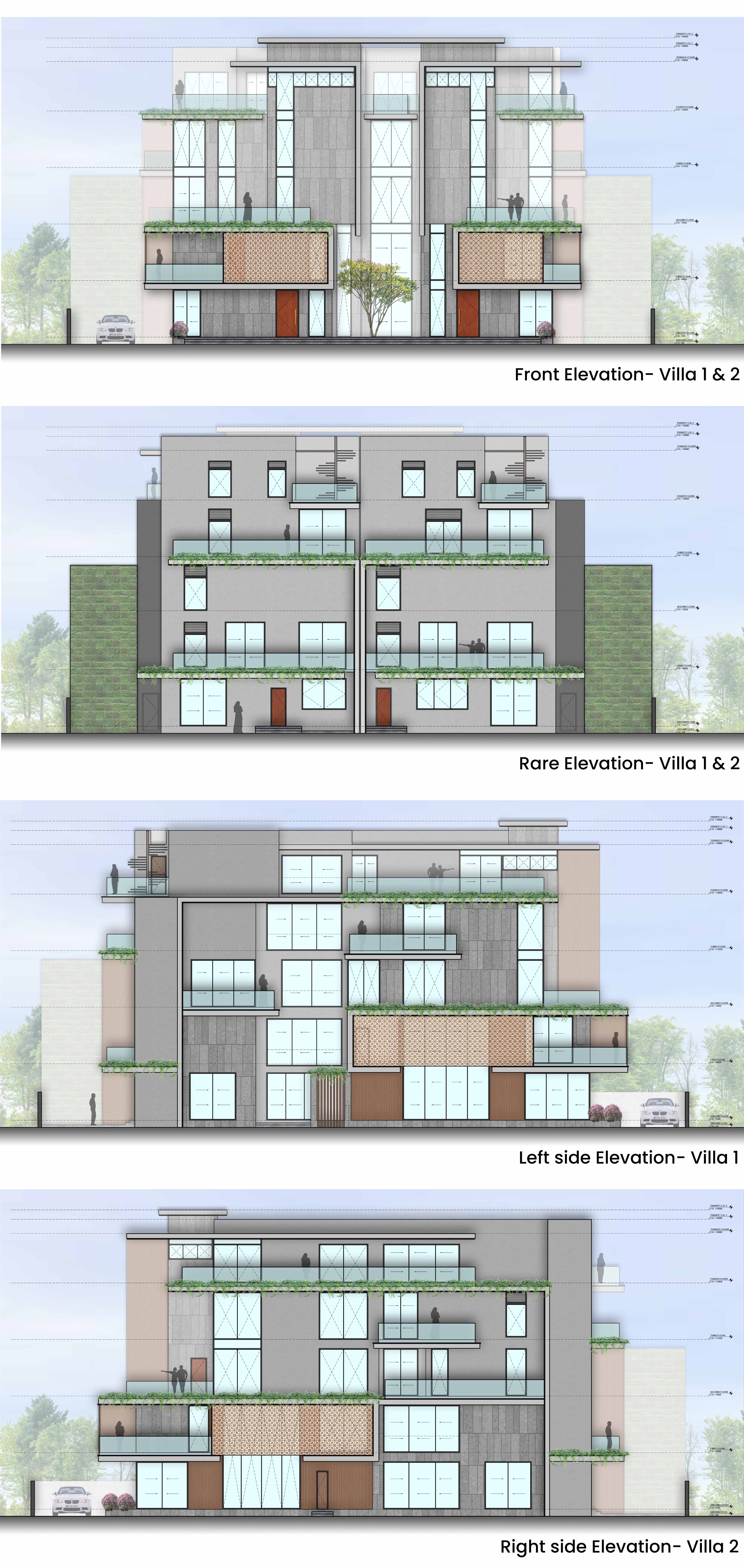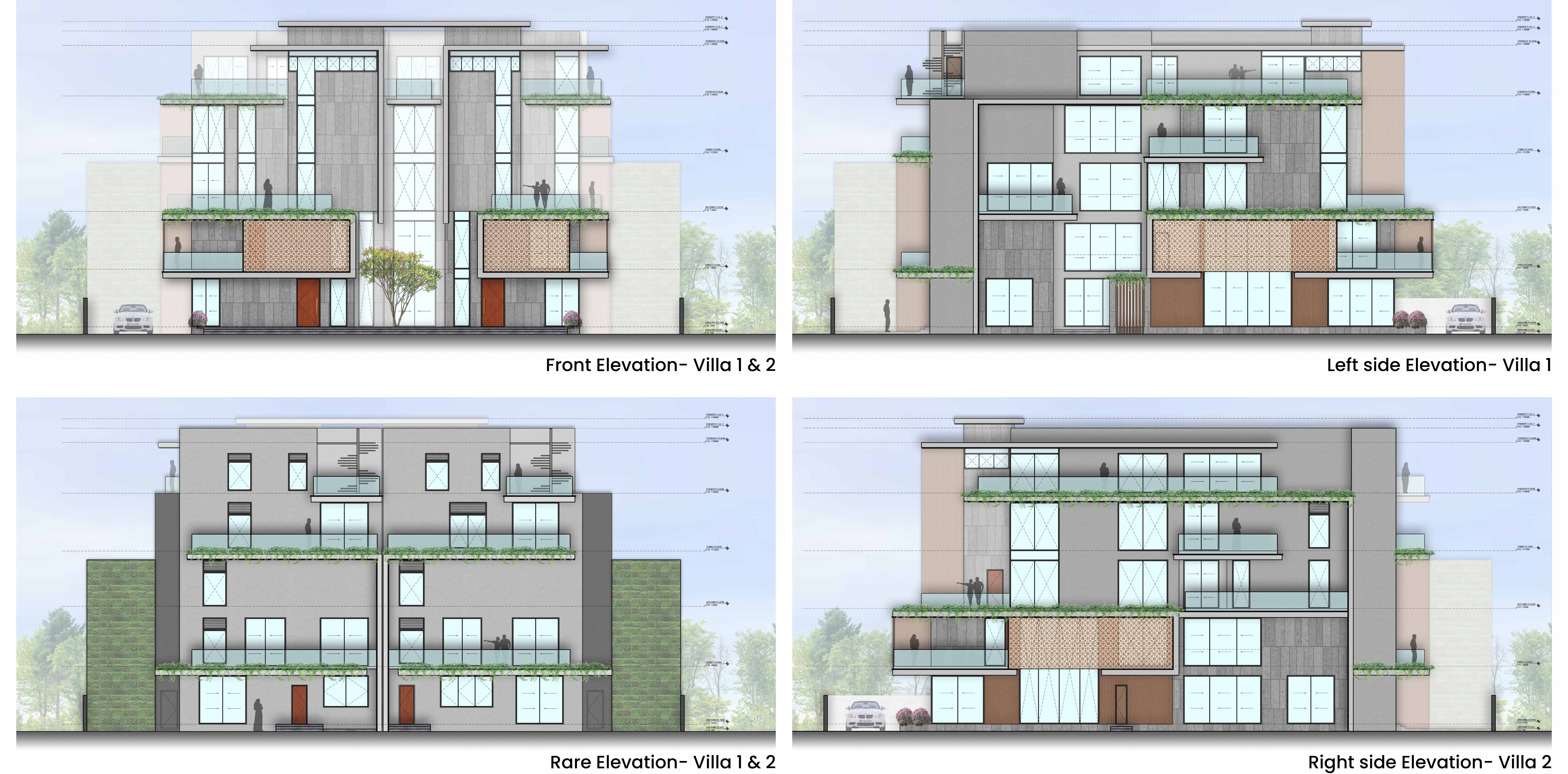 The design accommodates two independent residences within a unified framework, each equipped with expansive lawns, double-height spaces, and amenities tailored for comfortable, lavish living.