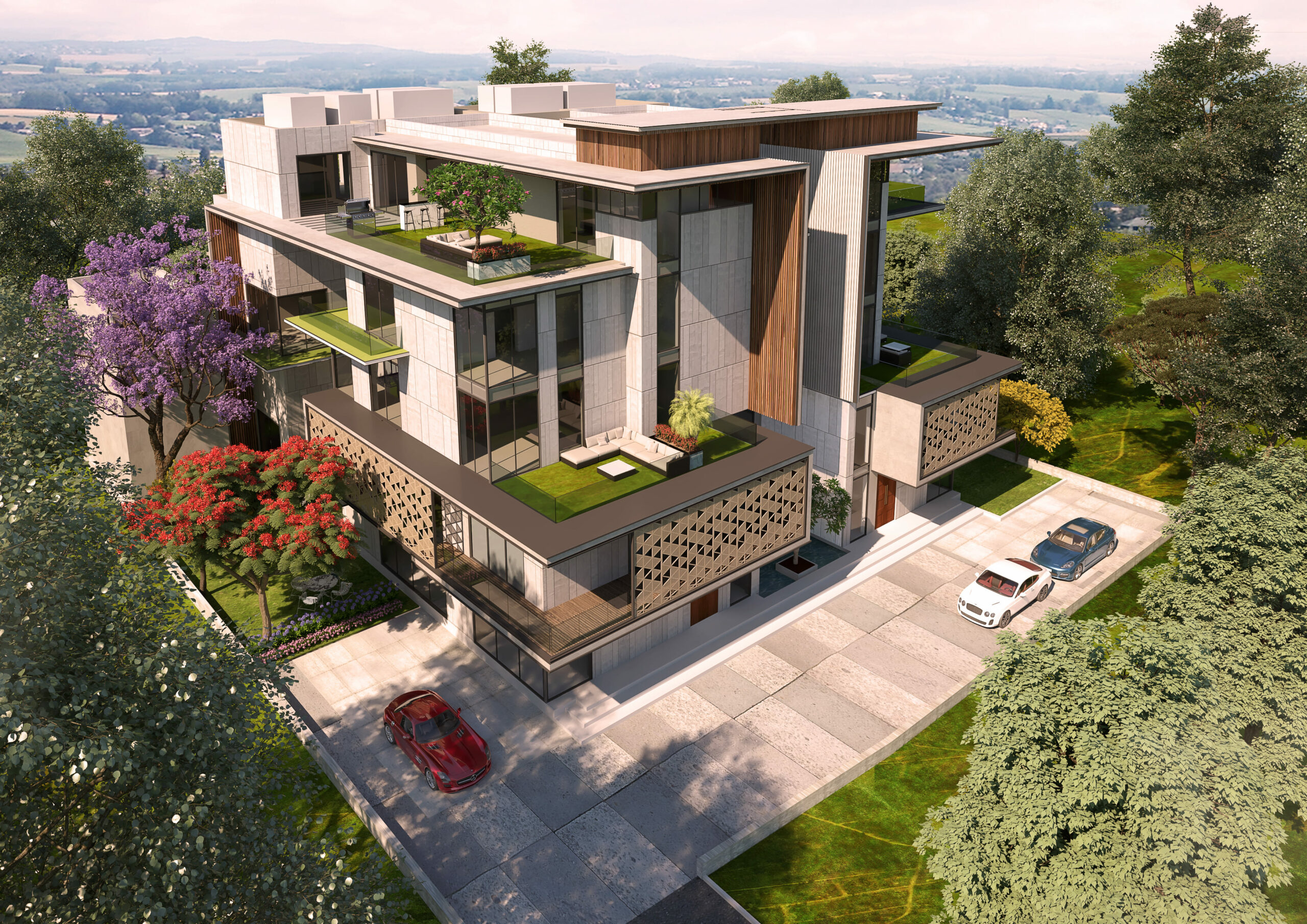 Architecturally, the residence expresses a refined interplay of glass, texture, and proportion.