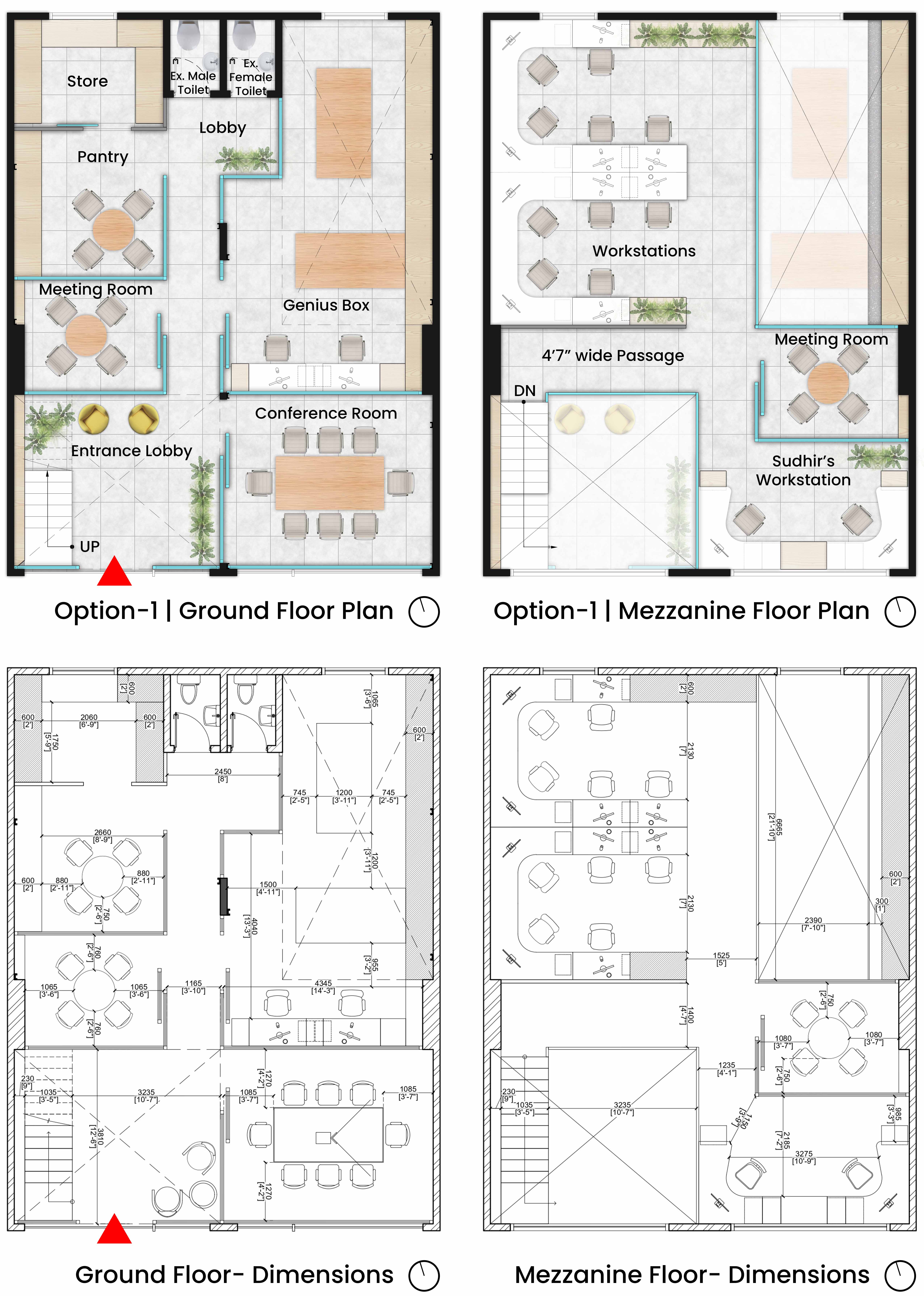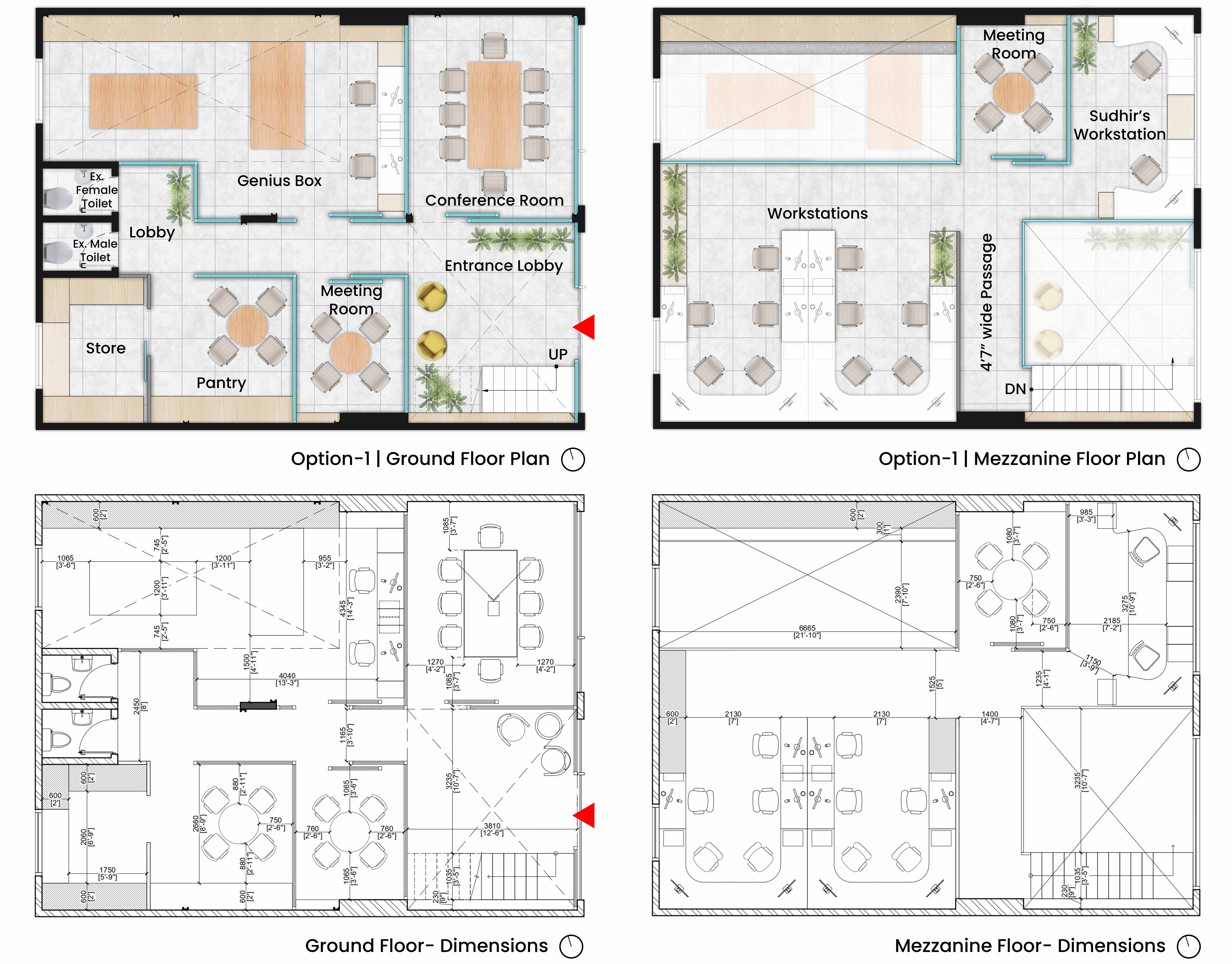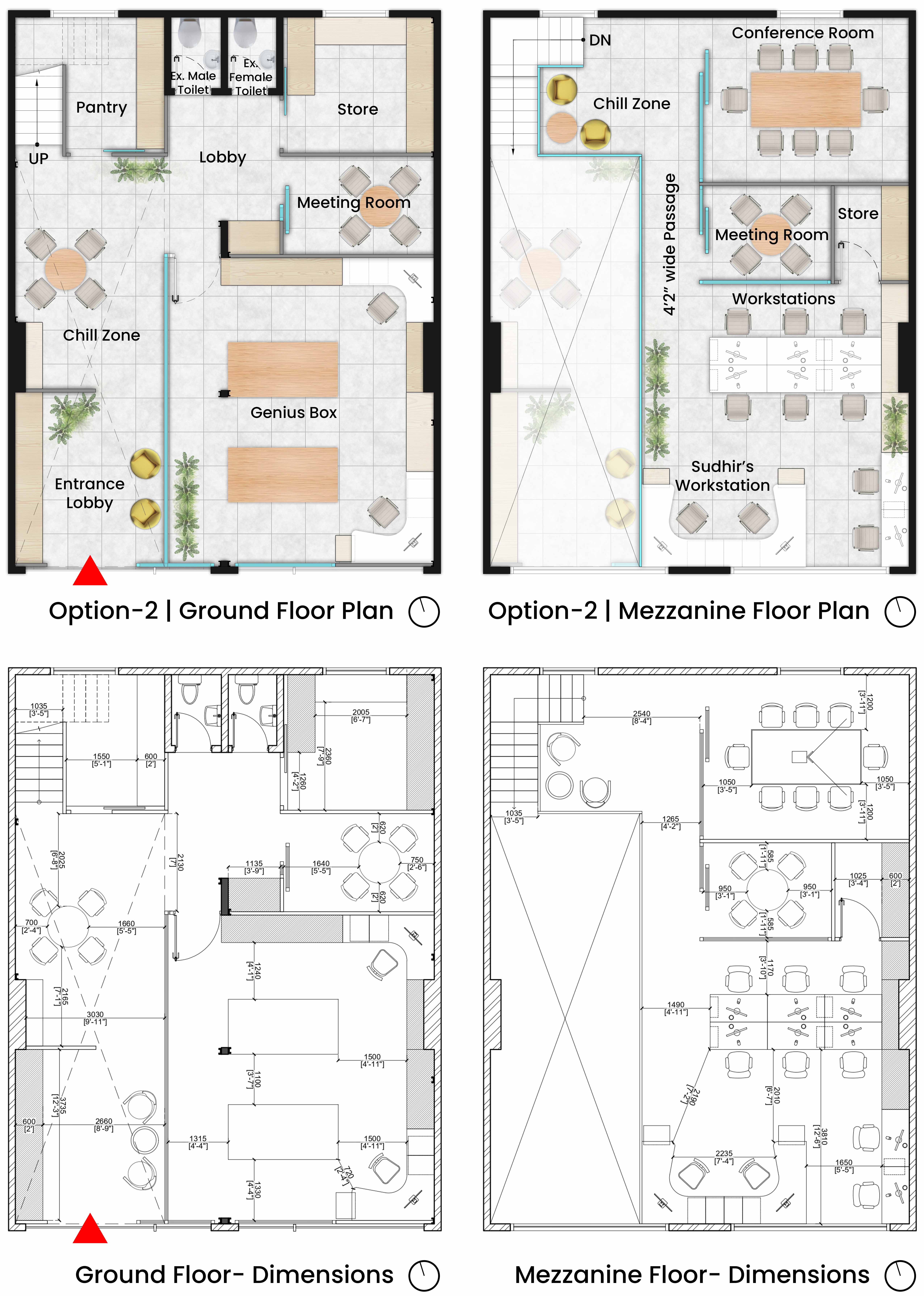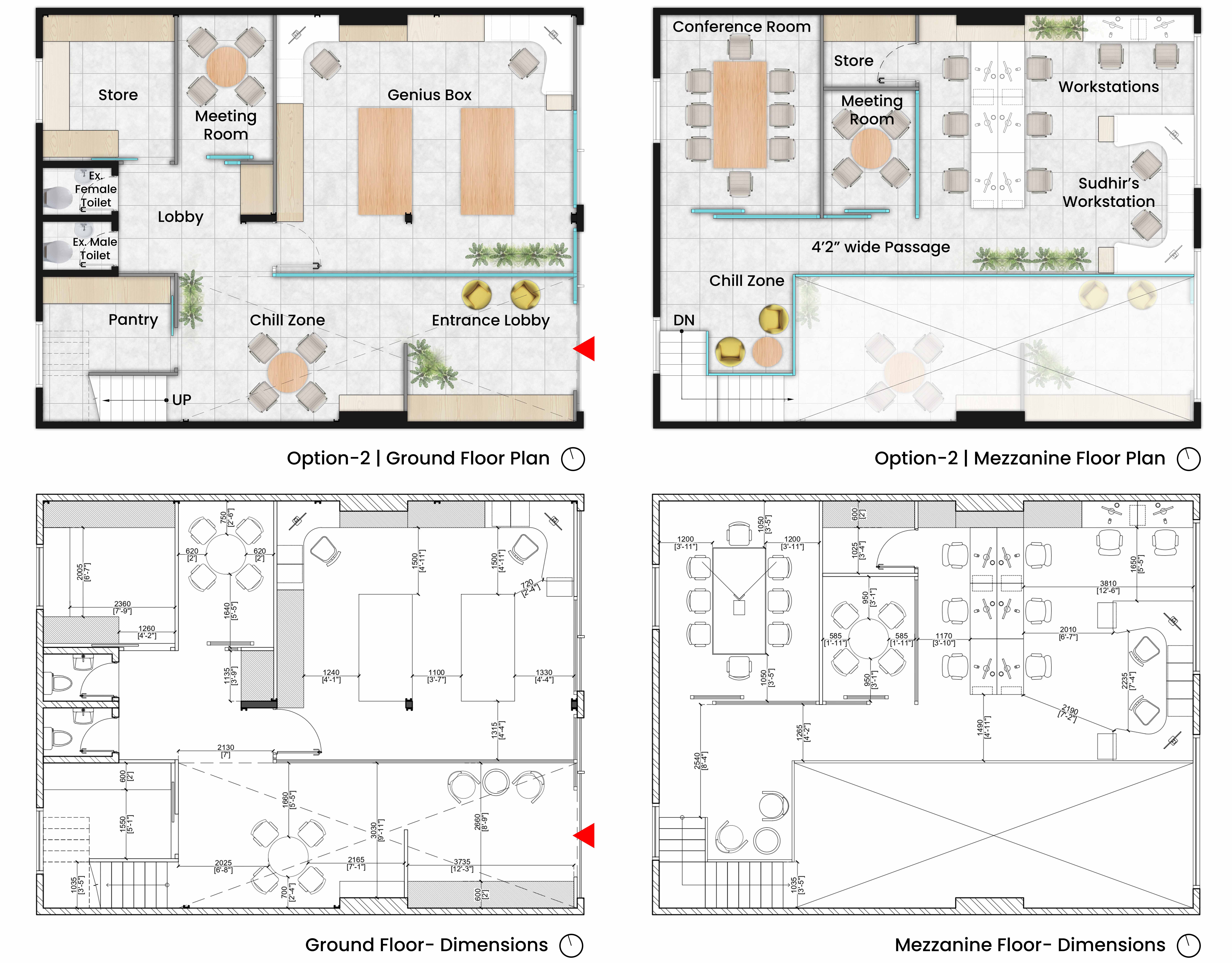 Option 01 introduces a 421 sq.ft structural cut-out to create a dramatic double-height zone at the entrance and Genius Box area, placing the conference room on the ground floor and separating leadership workstations for focused functioning. The staircase is positioned at the front, reinforcing visibility and hierarchy.
