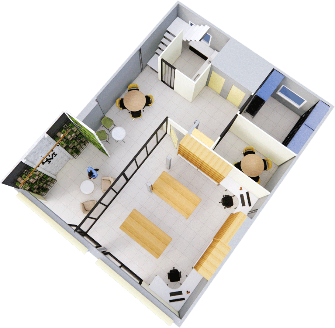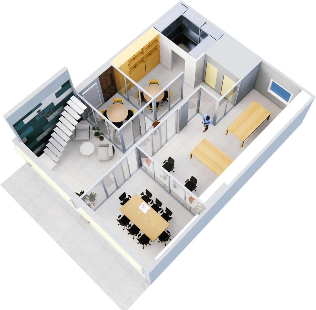 Located on the first floor of an industrial building, the proposal combines two adjacent office units (600 sq.ft each, 15’×40’×16’ height) into a single cohesive workspace.