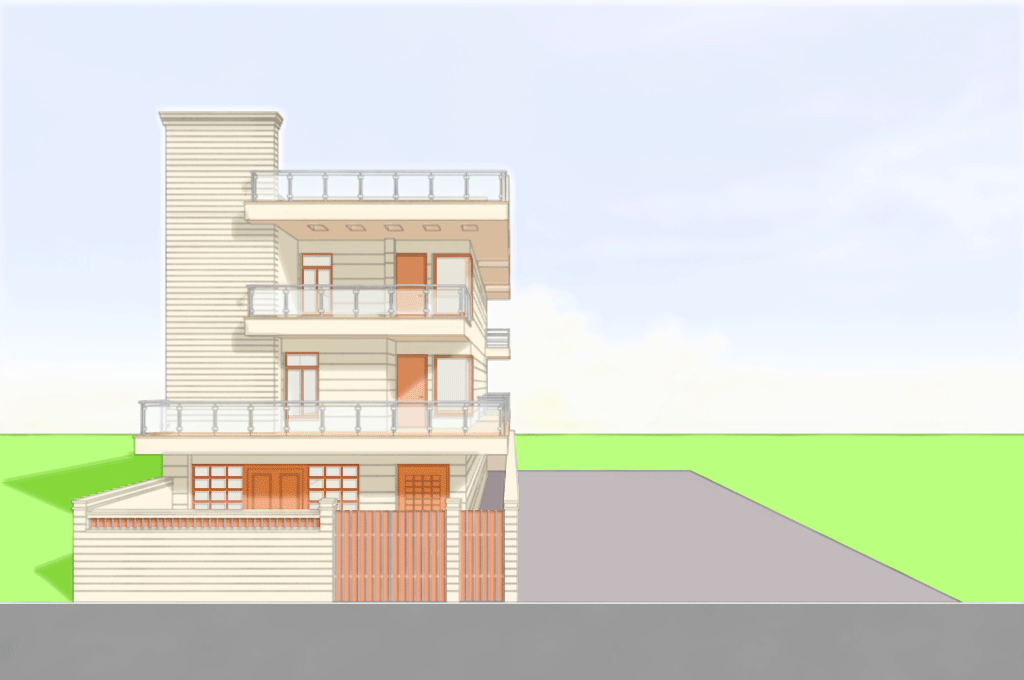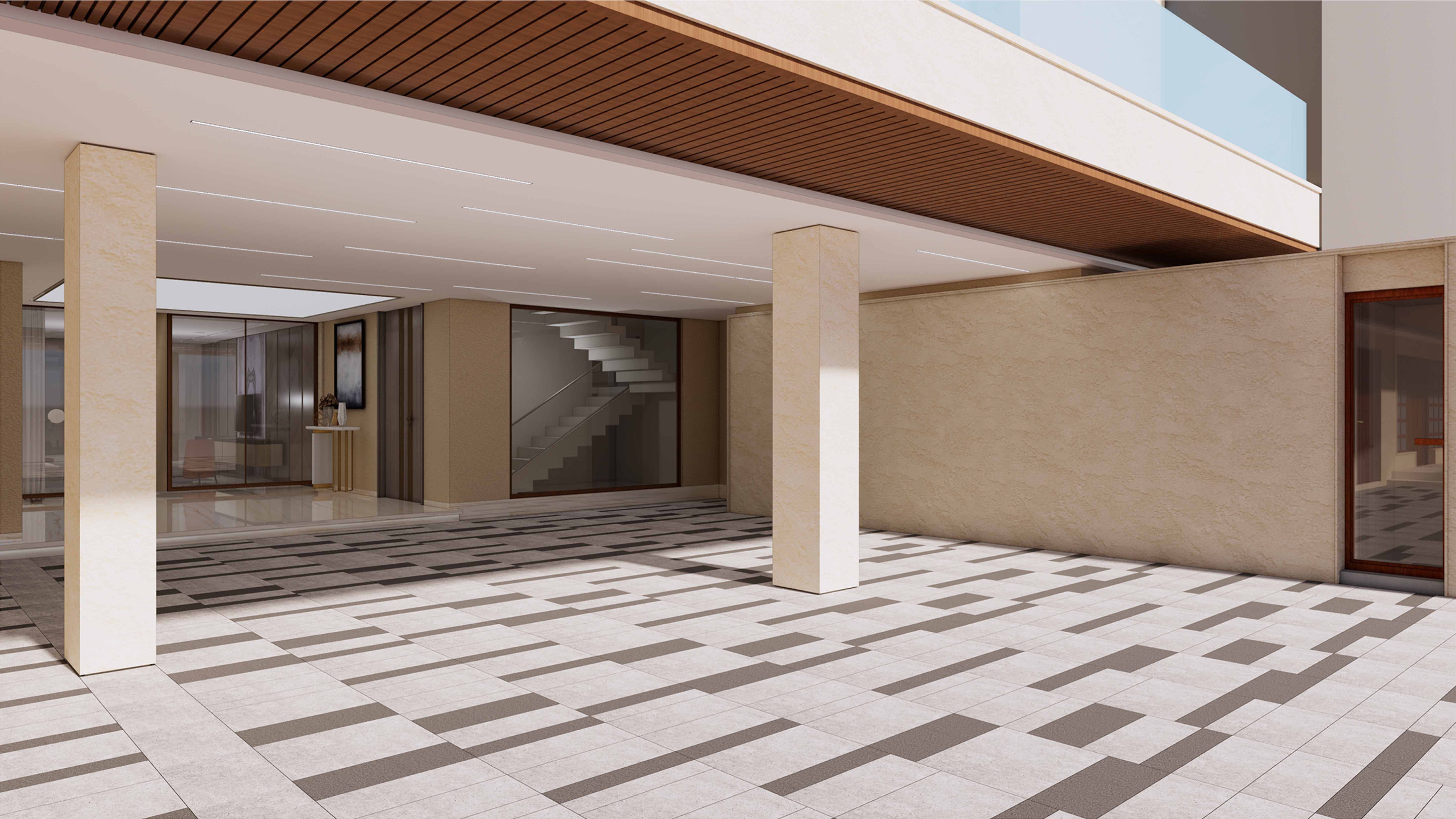 Wooden ceiling accents add warmth, while vertical slits and slender railings complete a composition that feels grounded, timeless, and harmoniously scaled within Noida’s urban fabric.
