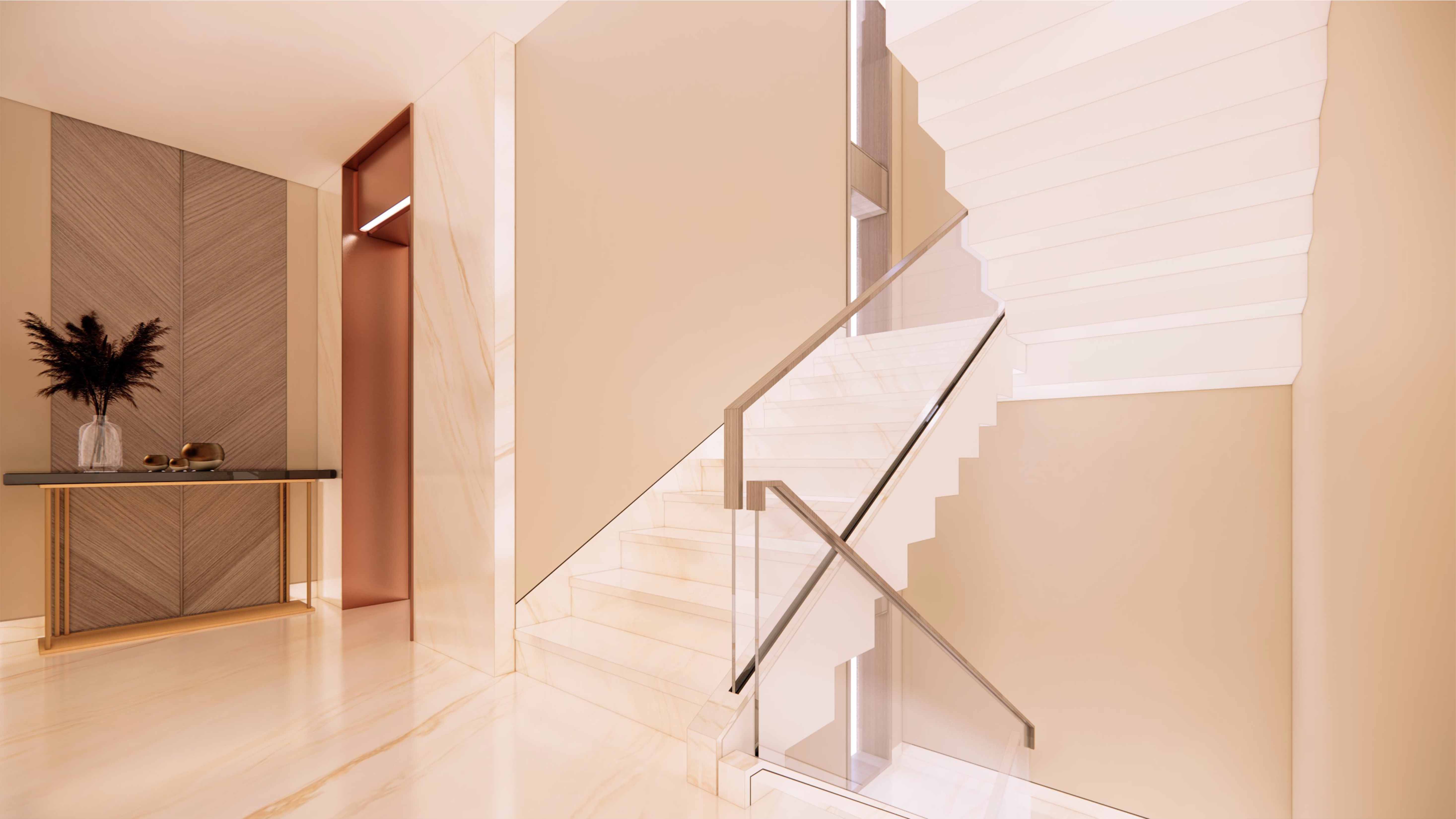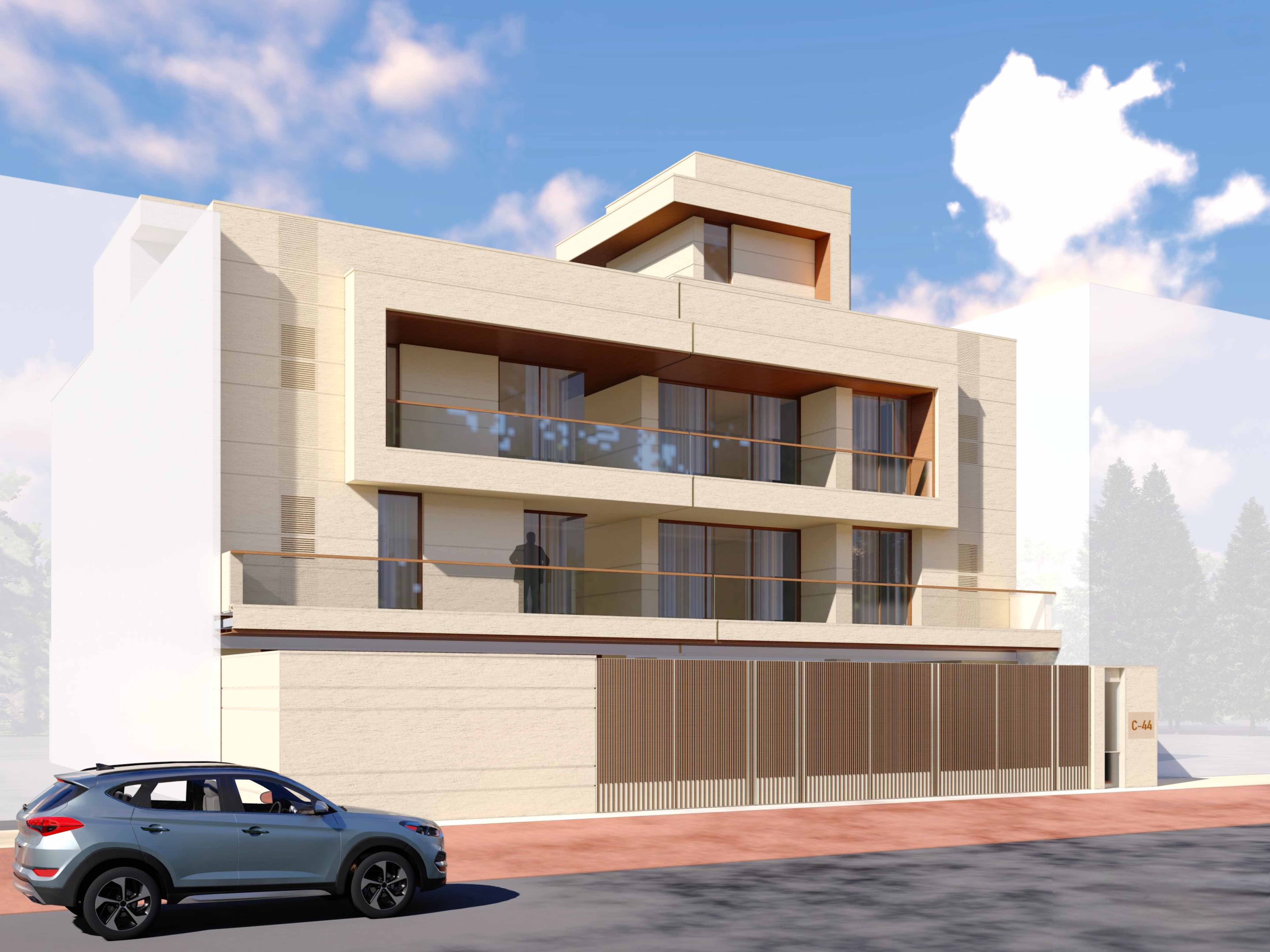 Clad in Mocha Crema stone, the elevation is defined by clean horizontals, recessed balconies, and subtle shadow play.