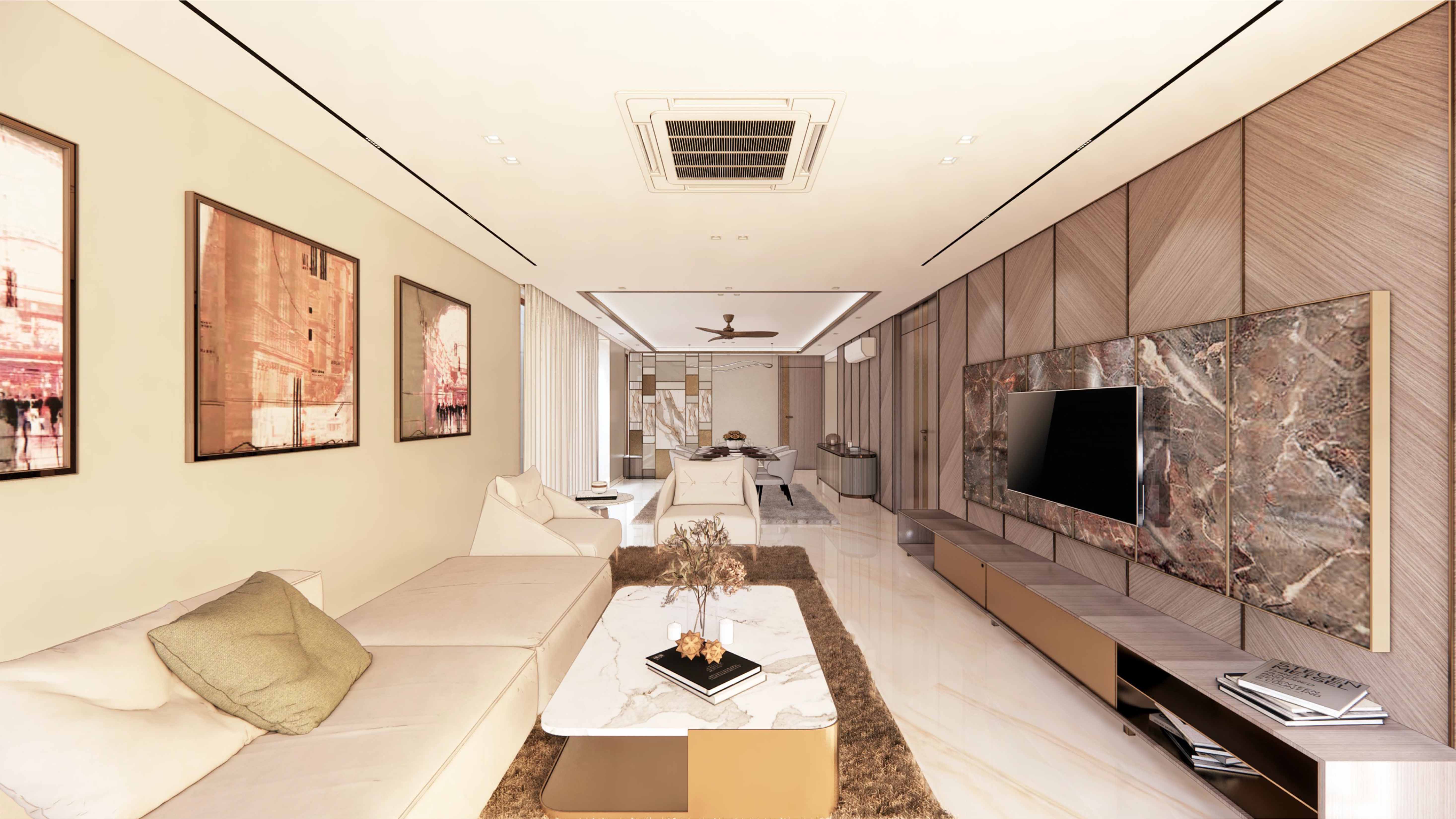 A sculpted wooden sectional with bronze accents anchors the living area, complemented by textured panels and marble details.