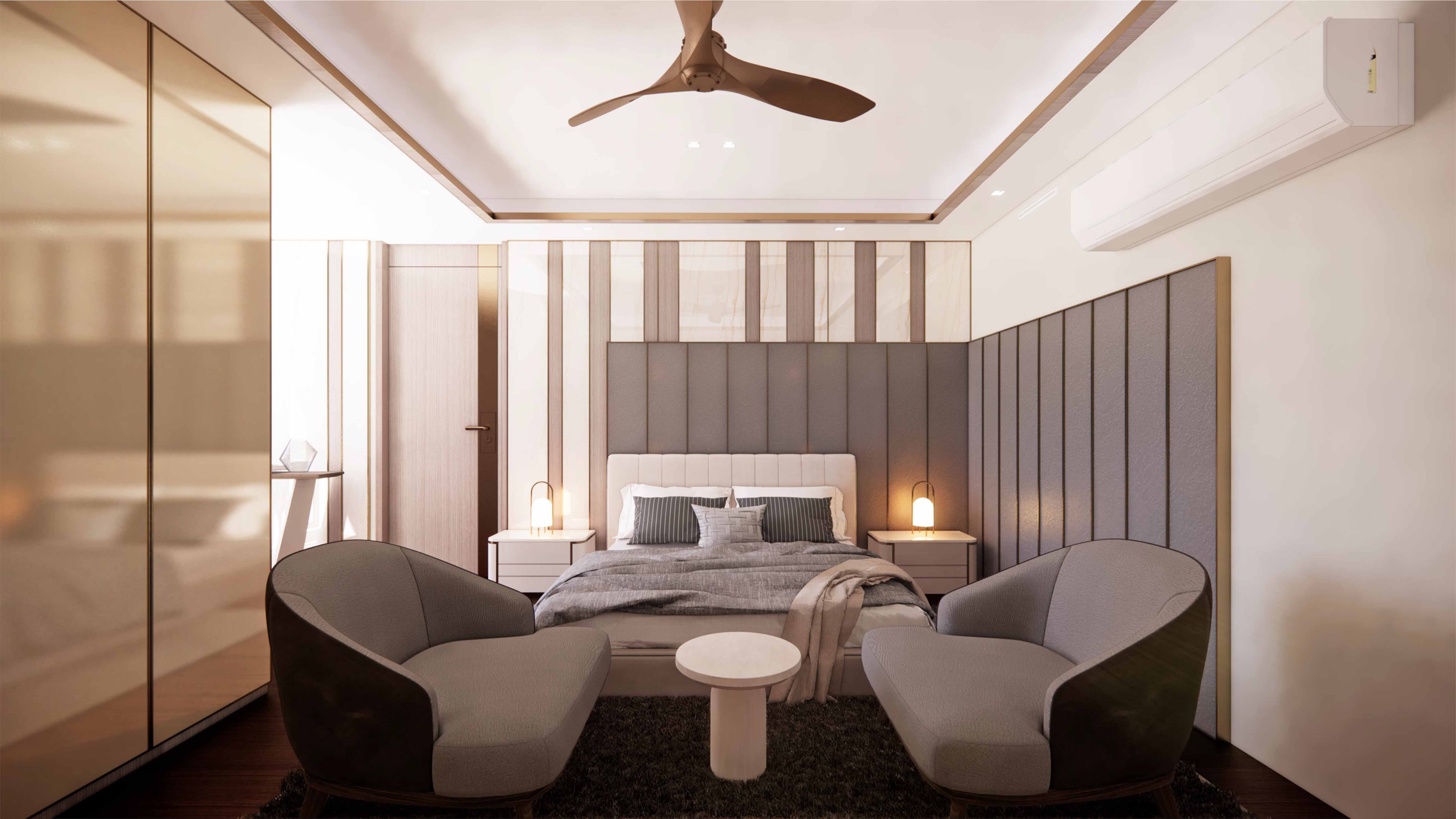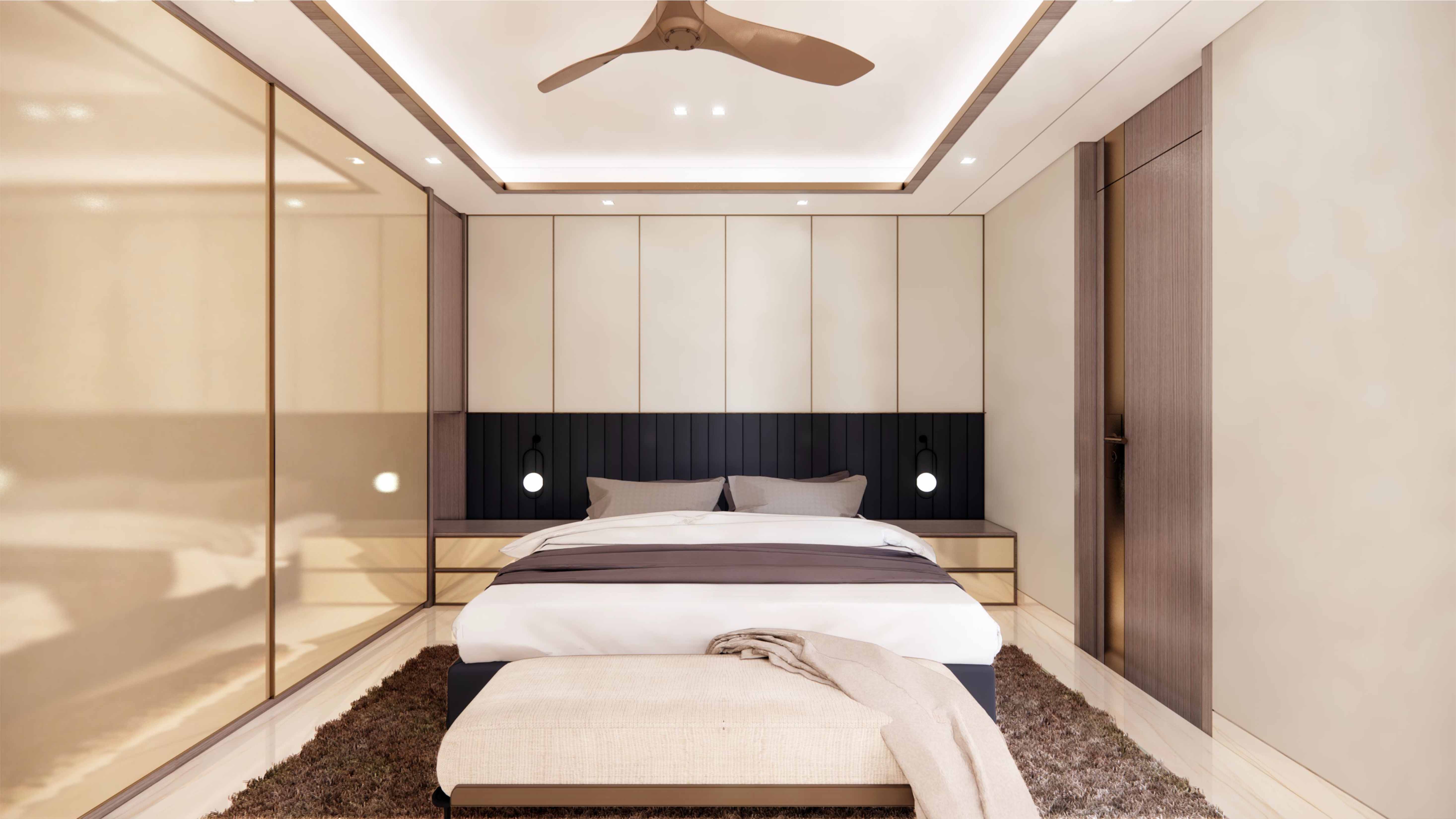 Bedrooms continue the restrained language with layered lighting, refined wood tones, and smooth finishes.