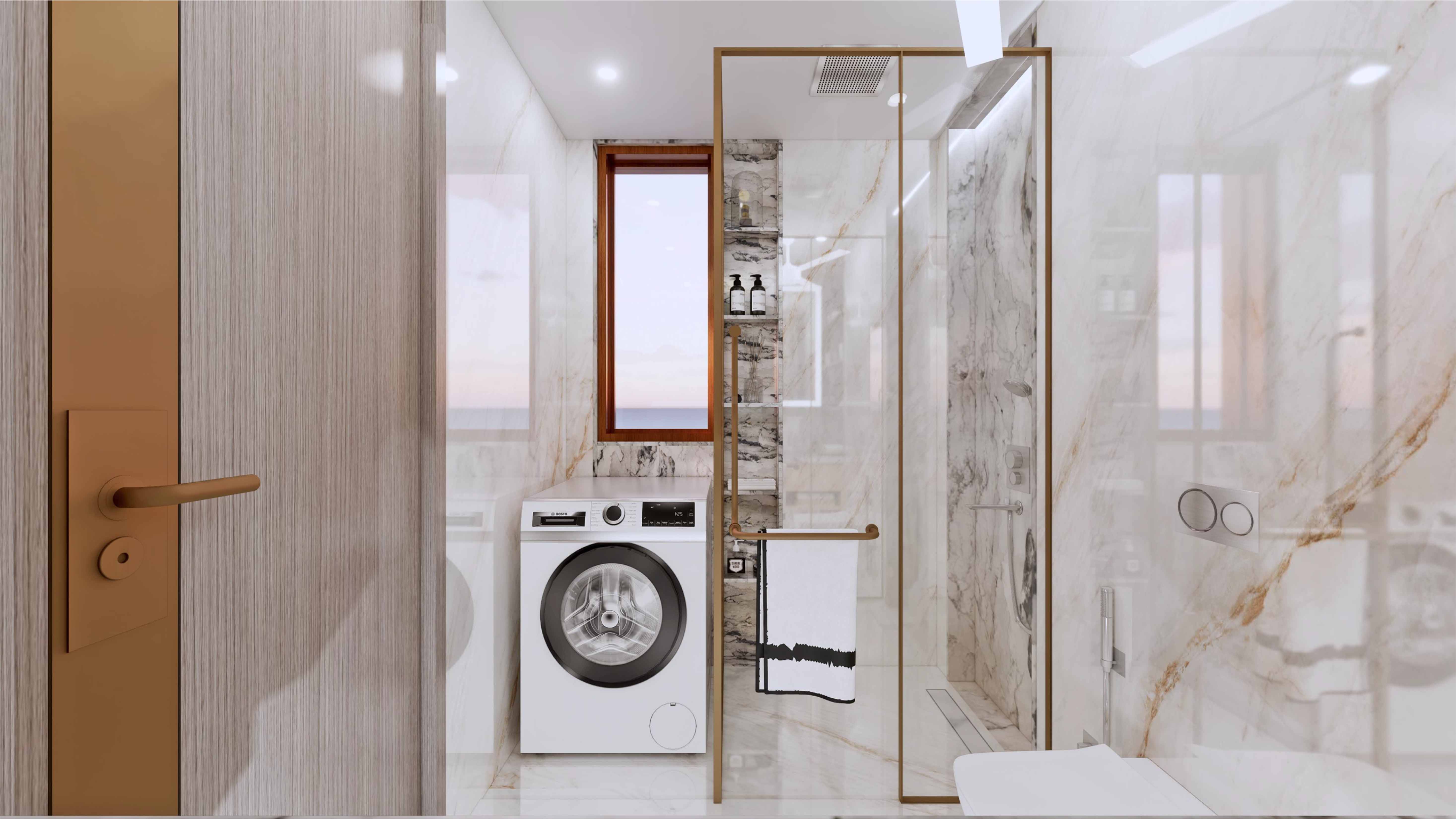 The interiors reflect understated elegance through a warm palette of natural materials, soft neutrals, and diffused light.