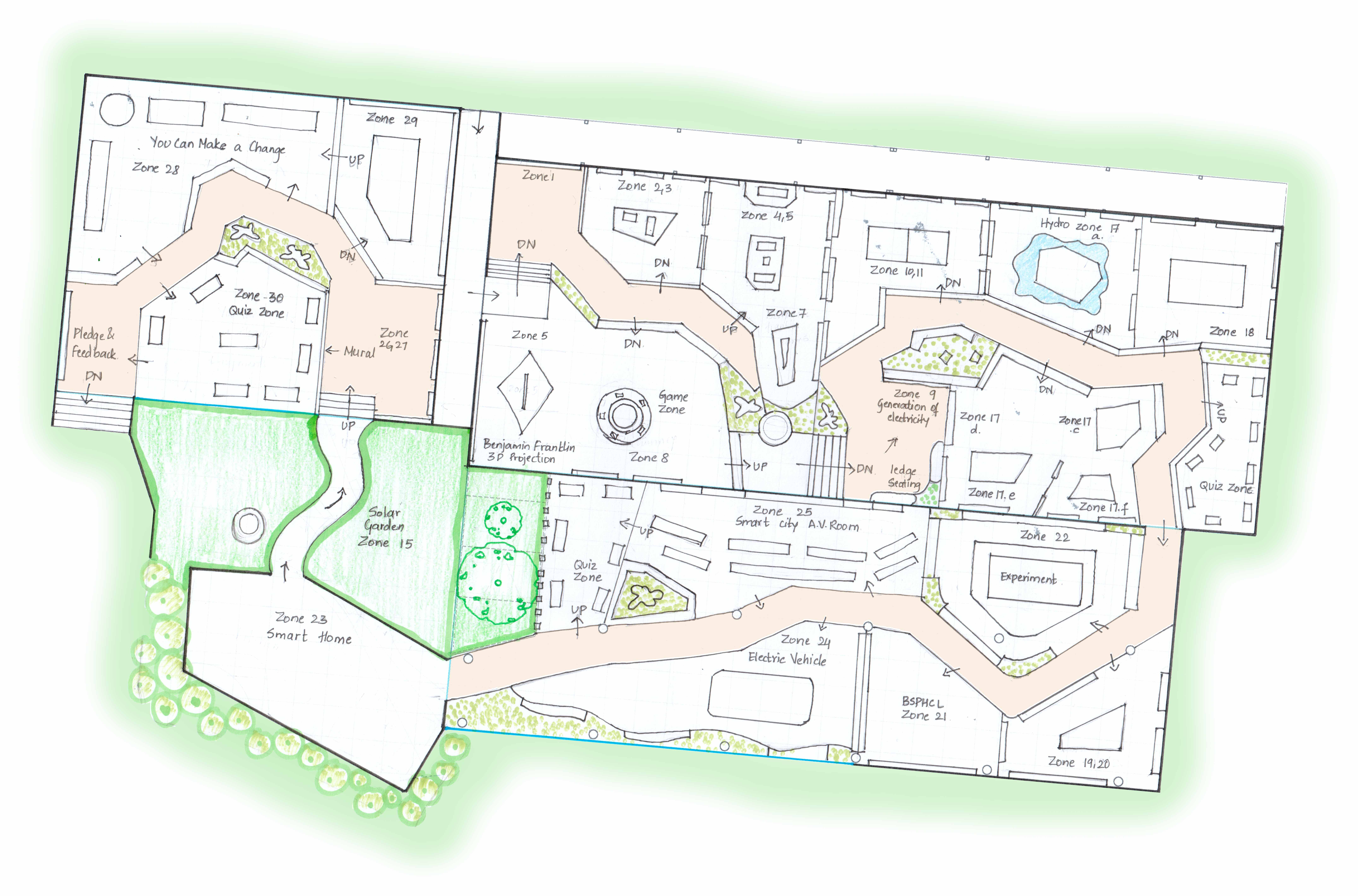 The spatial design blends industrial textures, greenery, and water bodies, echoing the feel of a real power facility. Functional indoor & outdoor setups of solar, wind, hydro, geothermal, and thermal systems allow visitors to experience power generation firsthand. Smart homes, EV displays, and human-powered stations offer deeper engagement, reinforcing the museum’s mission to educate and inspire awareness about energy and its future.