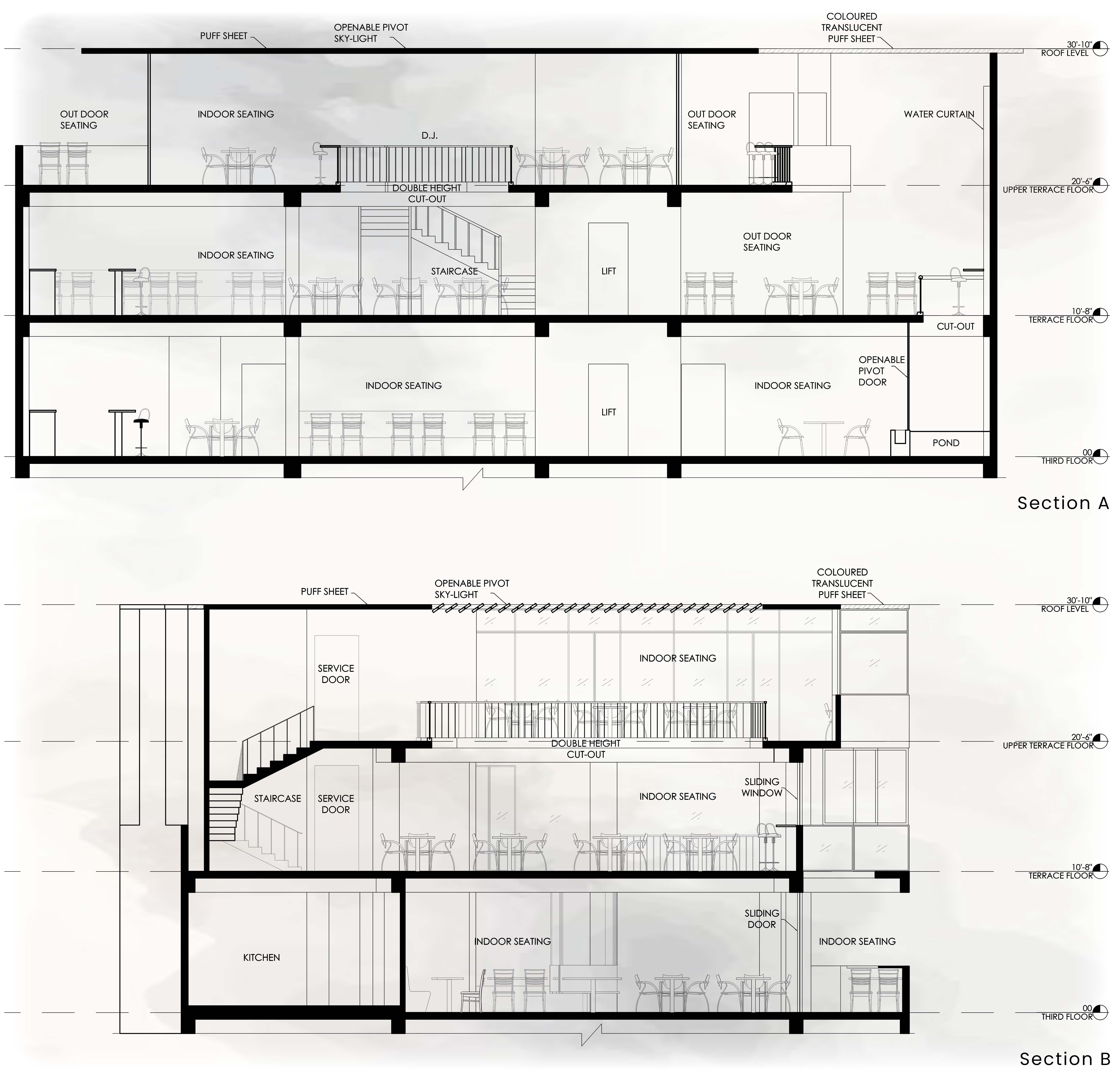 Occupying the upper two terrace levels, this venue is planned around a central clubbing zone that connects every area through cutouts, mezzanine links, and visual cross connections.